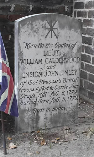 Among the headstones of Beaufort, South Carolina’s St. Helena Episcopal Church stands a single stone which denotes the burial site of two officers of the British Army, Lt. William Calderwood and Ens. John Finley. The burial site of Calderwood and Finley, located along the western wall of the churchyard, may be the only two identifiable gravesites, by name and location, of the estimated 47,000 British and Hessian soldiers who died fighting the Patriot army in the American Revolution. The headstone reads: